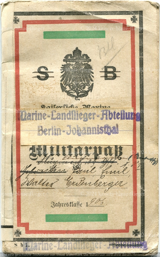Seine Spur verliert sich zunächst, bis er im Januar 1917 - inzwischen Obermatrose (befördert am 23. Juni 1908) - bei der Fliegerschule Johannisthal die Ausbildung zum Flugzeugführer begann. Den ersten und zweiten Teil der Pilotenprüfung legte er am 3. Mai 1917 auf dem Flugzeug mit der Kennung LF 156 erfolgreich ab. Die abschließende Feldpilotenprüfung bestand er am 16. Mai 1917 mit LF 81 ebenfalls erfolgreich. Den FAI-Ausweis Nr. 2297 erhielt er am 22. Mai 1917.