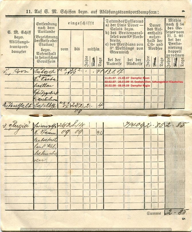 Die Reise mit dem Dampfer "Roon" begann am 11. Januar 1907 und dauerte bis zum 21. Februar 1907. In Kiautschou diente er zwei Jahre bei der 2. Kompanie des III. Seebataillons unter Major Hermann Credner.