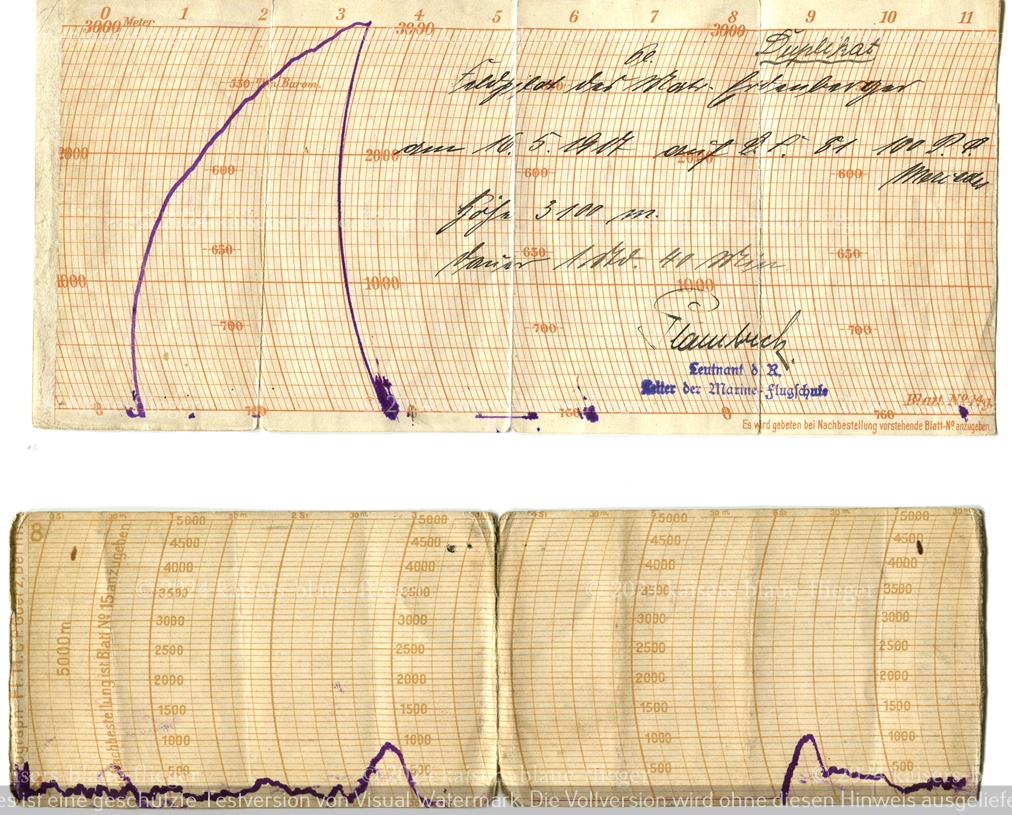 Barogrammstreifen der Feldpilotenprüfung am 16.05.1917 unterschrieben von Lt.d.R.M.A. Plambeck