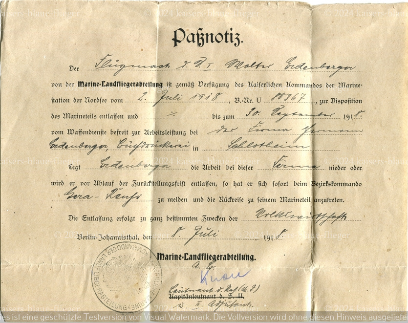 Im Jahr 1918 starb sein Vater Hermann Erdenberger unerwartet. Walter wurde daraufhin am 2. Juli 1918 zur Arbeitsleistung im Familienbetrieb entlassen. Die Fliegerzulage war ihm bereits am 3. Juni 1918 - vermutlich aus gesundheitlichen Gründen - gestrichen worden. Somit stand seiner Freistellung nichts im Wege.